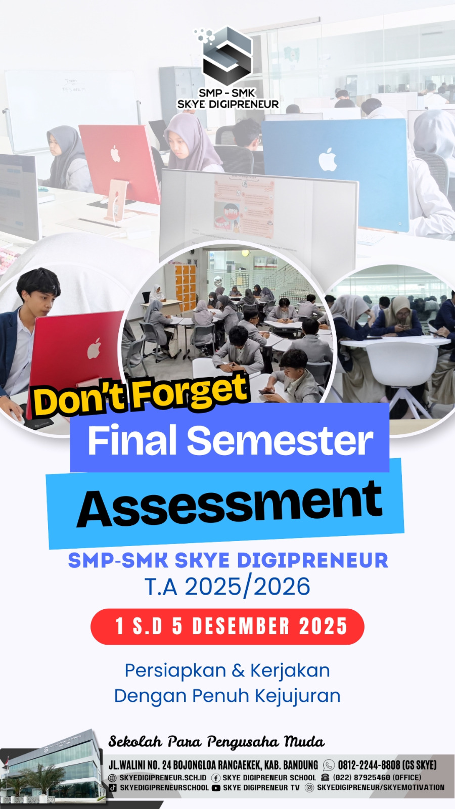 SMP–SMK Skye Digipreneur resmi melaksanakan kegiatan Final Semester Assessment (FSA) Ganjil Tahun Ajaran 2025/2026 yang berlangsung mulai 01 s.d. 05 Desember 2025. Kegiatan ini menjadi salah satu momen penting dalam perjalanan akademik student untuk mengukur pemahaman, kemampuan, serta pencapaian selama satu semester. 📘📝✨