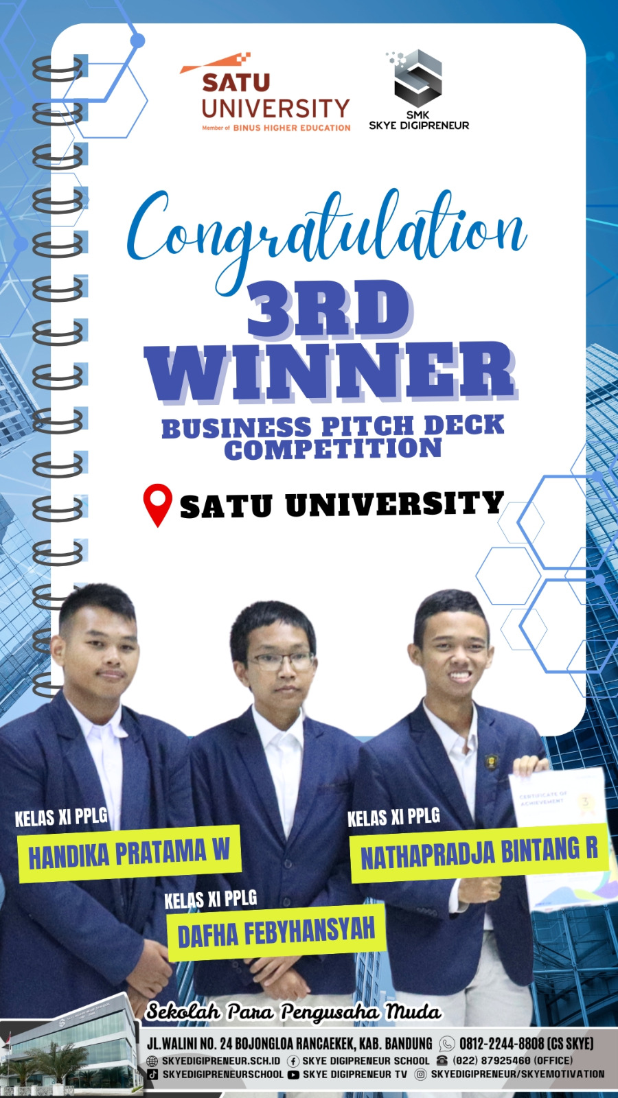#SkyeDigipreneur #PrestasiSkye #BusinessPitchDeckCompetition #SatuUniversity #Juara3 #StudentAchievement #EntrepreneurMuda #PPLGSkye #SkyeProud #BanggaJadiSkye #DigipreneurMuda #InspirasiAnakMuda #Entrepreneurship #KompetisiBisnis #InovasiAnakBangsa #Skyepreneur #SkyeSpirit #SkyeExcellence #SekolahBerprestasi #GenerasiDigital #SMKHebat #SMKBisa #SkyeInAction #MotivasiSukses #FutureEntrepreneurs #SkyeForSuccess