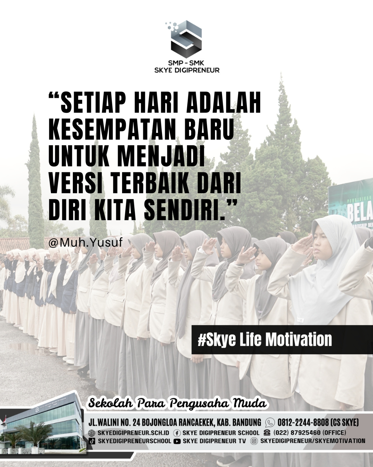 Bagi para student dan seluruh keluarga besar Skye Digipreneur, motivasi ini menjadi dorongan untuk terus berkembang—baik dalam akademik, karakter, maupun jiwa kewirausahaan. Dengan konsistensi, disiplin, dan niat yang kuat, perubahan kecil yang dilakukan setiap hari akan menghasilkan dampak besar di masa depan. 🌟✨💼📚