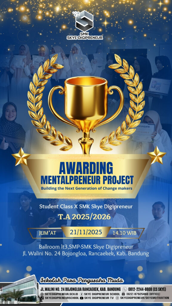 SMK Skye Digipreneur kembali menghadirkan momen inspiratif melalui kegiatan “Awarding Mentalpreneur Project β Building the Next Generation of Change Makers” yang merupakan puncak dari rangkaian pembelajaran berbasis entrepreneurship bagi student kelas X Tahun Ajaran 2025/2026.