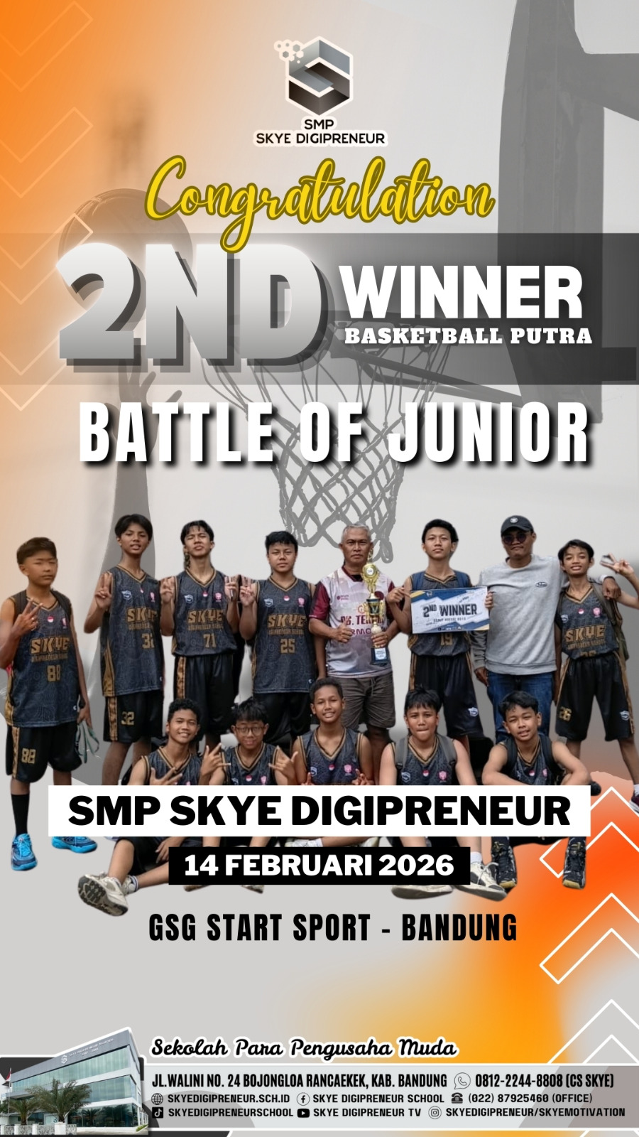 SMP Skye Digipreneur kembali menorehkan prestasi membanggakan di bidang olahraga. Tim Basket Putra SMP Skye Digipreneur berhasil meraih Juara 2 dalam kompetisi Basketball Putra Battle Of Junior yang diselenggarakan pada tanggal 14 Februari 2026.